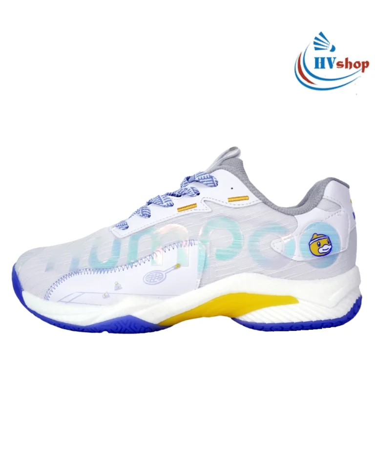 Kumpoo KH-D72 PRO B.DUCK nổi bật với thiết kế hiện đại, sử dụng tông màu trắng tím làm chủ đạo, mang lại vẻ ngoài thanh lịch nhưng vẫn đầy cá tính. Điểm nhấn đặc biệt của đôi giày là các chi tiết hình vịt B.DUCK ngộ nghĩnh được lồng ghép tinh tế, tạo cảm giác vui tươi và năng động. Hình ảnh chú vịt không chỉ mang lại sự độc đáo, mà còn thể hiện phong cách trẻ trung, phù hợp với người chơi yêu thích sự mới lạ. Thiết kế này không chỉ giúp nổi bật trên sân mà còn dễ dàng phối hợp với nhiều trang phục thể thao.