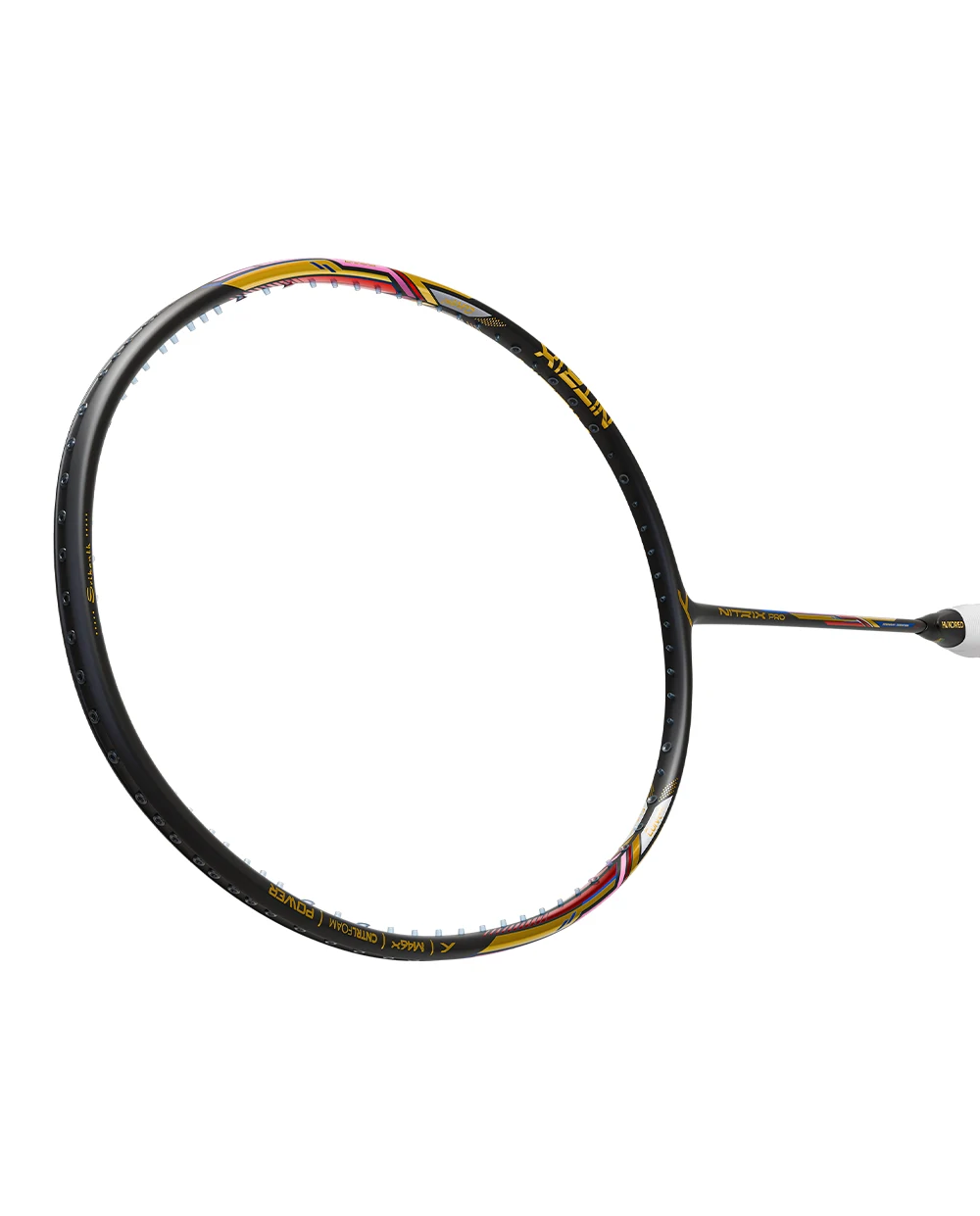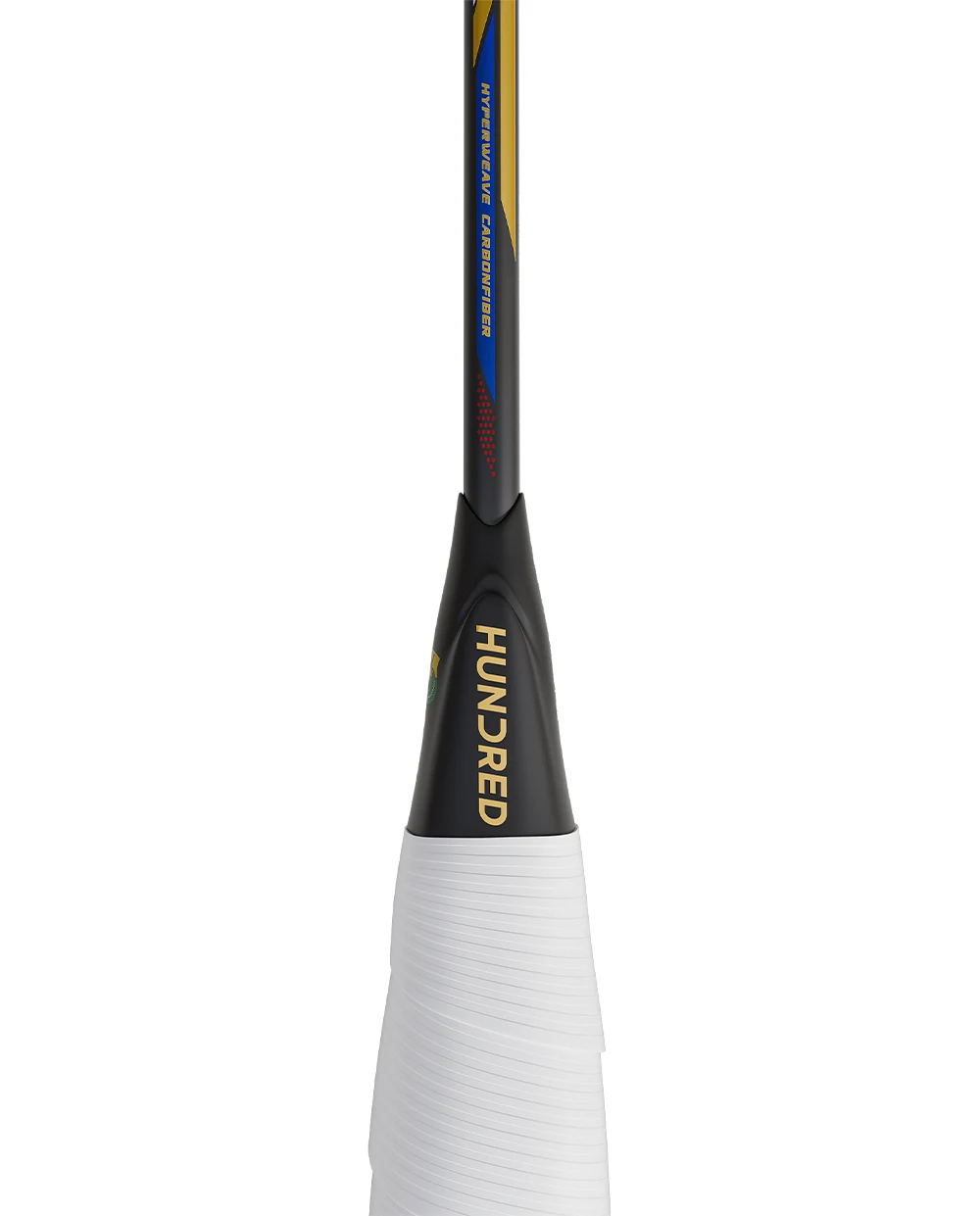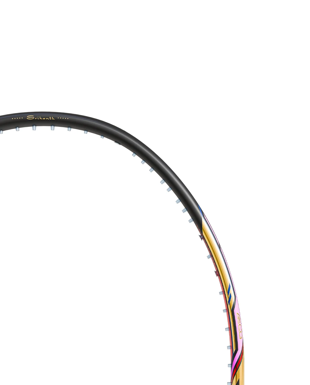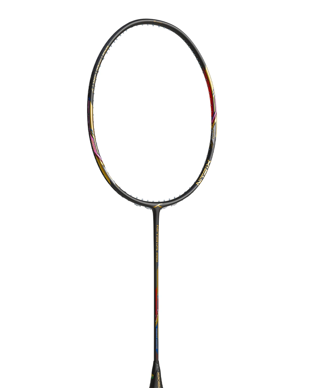 Ngoài ra, Hundred Nitrix Pro nổi bật với lớp sơn đen sang trọng, toát lên vẻ mạnh mẽ và đẳng cấp. Các chi tiết màu vàng gold, đỏ và xanh được điểm xuyết tinh tế, uốn lượn quanh khung vợt, tạo nên tổng thể đầy cuốn hút. Thiết kế này không chỉ mang tính thẩm mỹ cao mà còn phản ánh tinh thần thi đấu quyết liệt, nhưng không kém phần tinh tế và hào hoa của cựu số 1 thế giới Srikanth Kidambi.