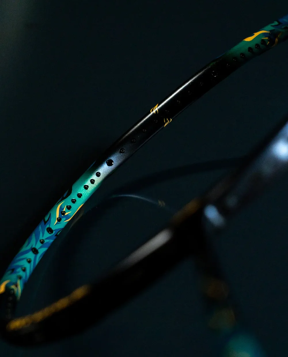 Tông màu chủ đạo là sự kết hợp giữa màu đen huyền bí và vàng đồng sang trọng, được điểm xuyết bằng các chi tiết màu xanh lam, tạo nên một tổng thể hài hòa, cuốn hút và đầy uy lực. Trên thân vợt, các họa tiết đầu thú Kỳ Lân được thể hiện một cách sống động, uốn lượn cùng những ngọn lửa, biểu trưng cho khí chất và sức mạnh bùng nổ.